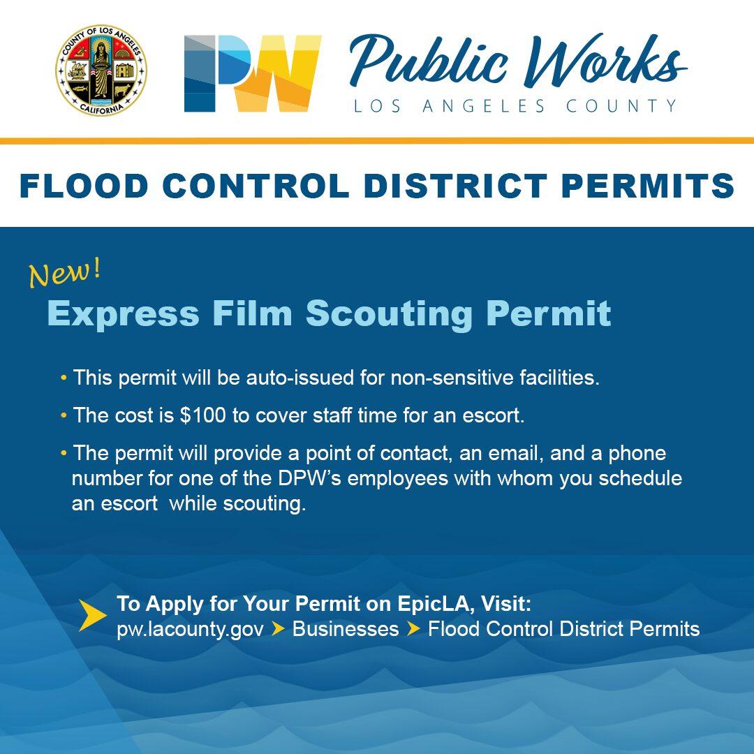 Please note that the Express Flood Film Scouting Permit is obtained independent of an on location filming permit and cannot be applied for through the MyFilmLA permit system. It must be applied for via EpicLA.