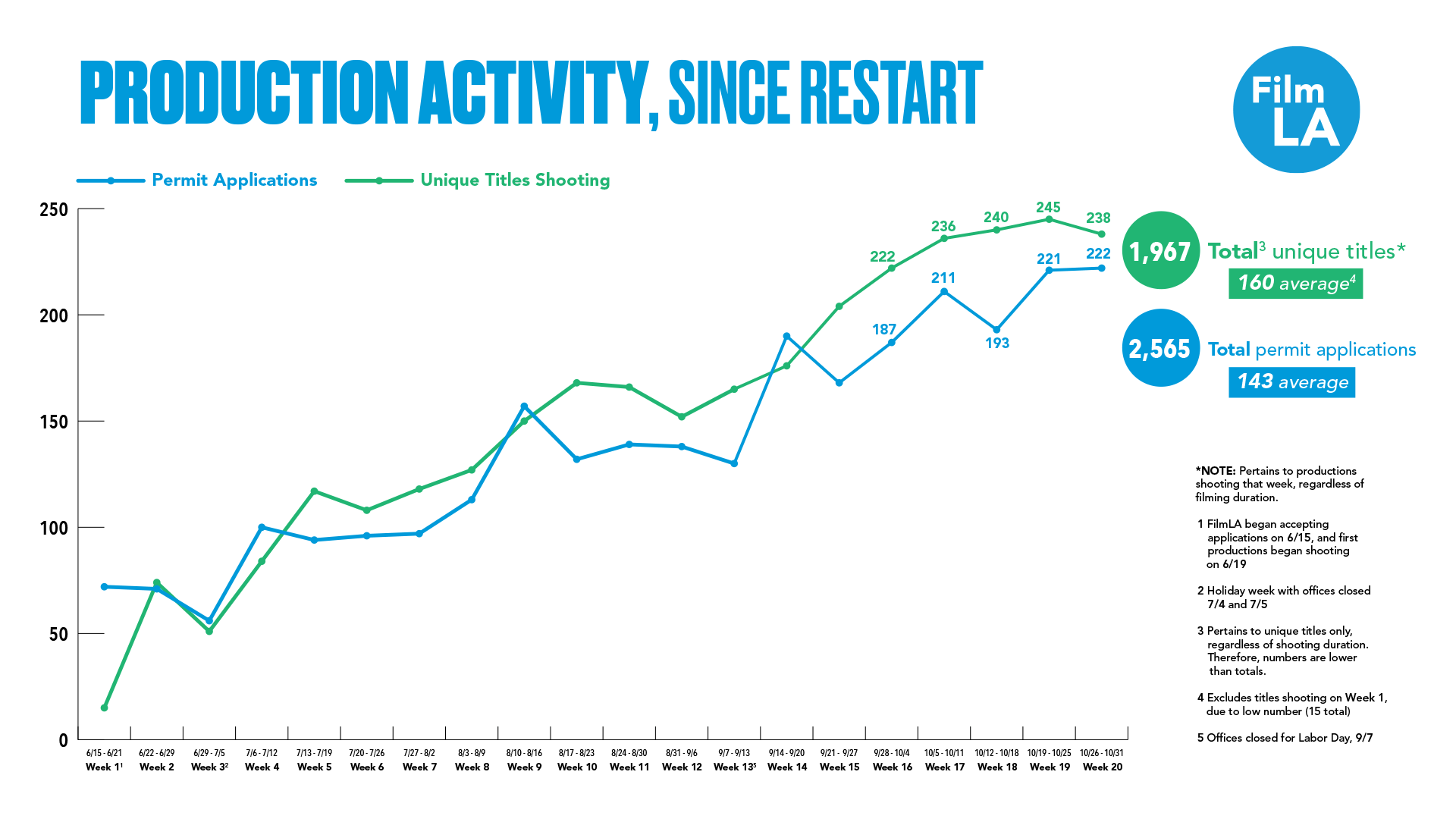 Over the last twenty weeks, FilmLA has received approximately 2,565 film permit applications spanning 1,967 unique projects. Monthly application intake increased 23.7 percent in October (to 880 permits) as compared to September (711 permits), and FilmLA’s daily intake now averages around 40 new applications per business day. Overall, activity levels have stabilized at just under 47 percent of what analysts would expect under normal filming conditions. FilmLA’s average rate of business growth has slowed somewhat. Across weeks 17-20 new application intake grew 4.8 percent; in weeks 13-16 it grew 10.0 percent.