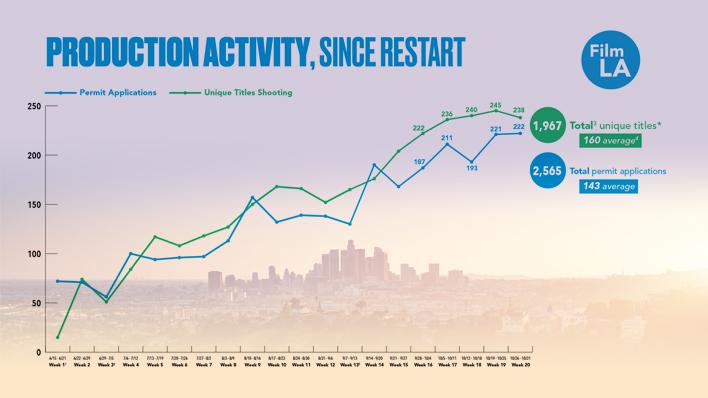 “As Los Angeles welcomes more episodic series and feature films back to production, we are grateful to local producers, crew and vendors for their adherence to safe filming practices. To push past our current production plateau with full community support, we need to continue to focus on keeping our workplaces safe.”